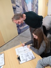 Anschließend arbeiteten sie kreativ und motiviert an ihren eigenen Karikaturen. Stephan Rürup gab wertvolle Tipps und begleitete die Teilnehmenden individuell und wertschätzend in ihrem Schaffensprozess. Aber auch der schulübergreifende Austausch der Jugendlichen untereinander wurde als besonders gewinnbringend empfunden.