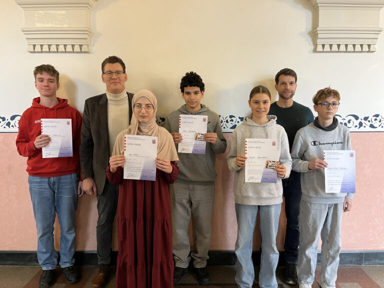 Besonders stark waren fünf Schülerinnen und Schüler, die mit einer Urkunde, sowie einem Kinogutschein von dem Schulleiter, Herrn Bollmann, und dem Fachsprecher der Mathematik, Herrn Franz, ausgezeichnet wurden. Wir gratulieren ganz herzlich und sind sehr stolz darauf, dass diese fünf Schülerinnen und Schüler unsere Schule in der zweiten Runde des Wettbewerbs vertreten dürfen: Lev Ladovyria, Abir Idris, Yassin Boukriate, Emilia Weinmeister und ein weiterer Schüler, der Klasse 7e. Allen wünschen wir viel Erfolg in der zweiten Runde des Wettbewerbs. (Bildquelle: J. Franz)