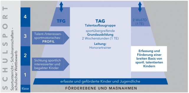 Der wöchentliche Trainingsumfang der TAG beträgt 2 Stunden in einer Trainingseinheit. Die Gruppengröße liegt bei ca. 15-20 Teilnehmerinnen und Teilnehmern. Eine enge Verzahnung aller Sichtungs- und Fördermaßnahmen mit den beteiligten Vereinen und Fachverbänden ist während des gesamten schulischen Förderzeitraums gewünscht.